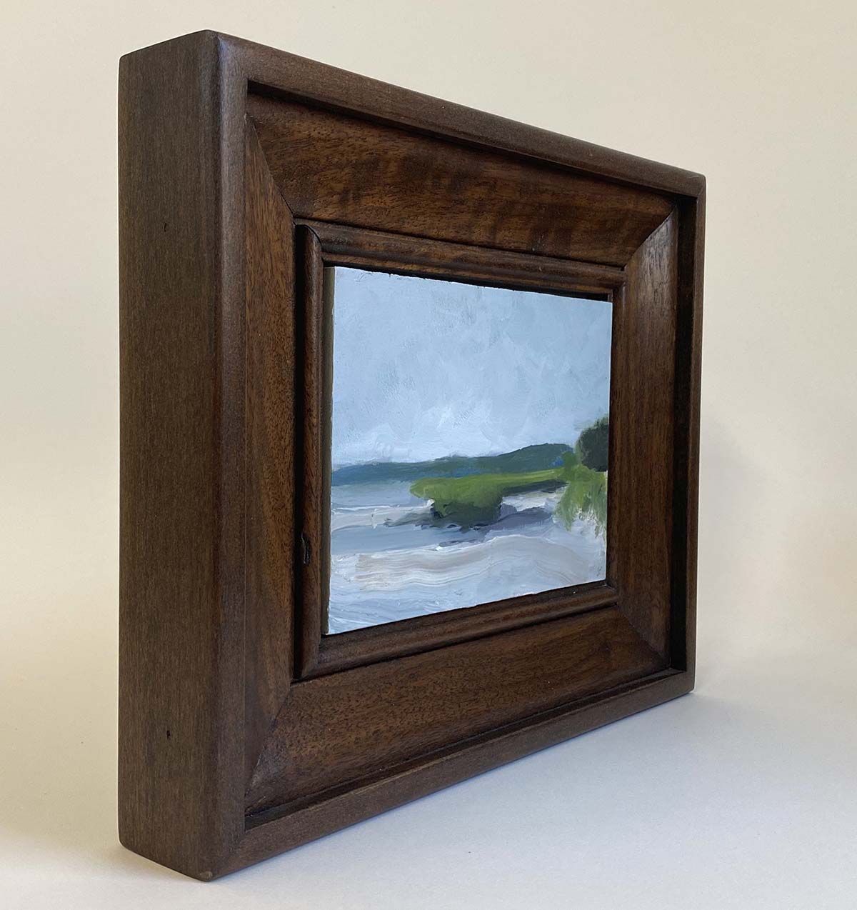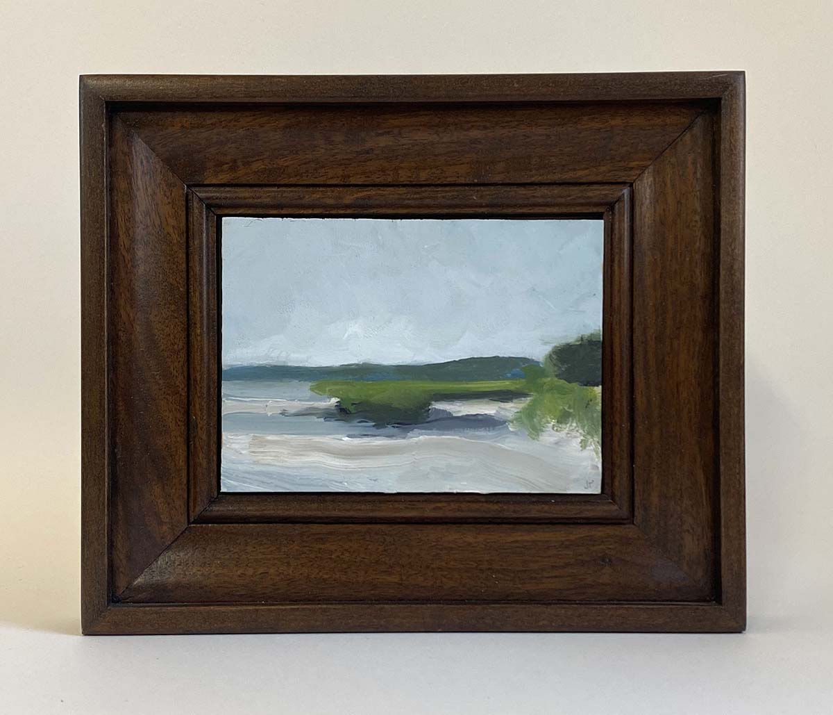This is the southern view of the sandbar in Navesink River just East of the oceanic bridge during low tide. I framed this painting in a large solid walnut frame. Sometimes I like to frame small paintings like this and a large frame to kind of set them off and provide the painting with its own environment.